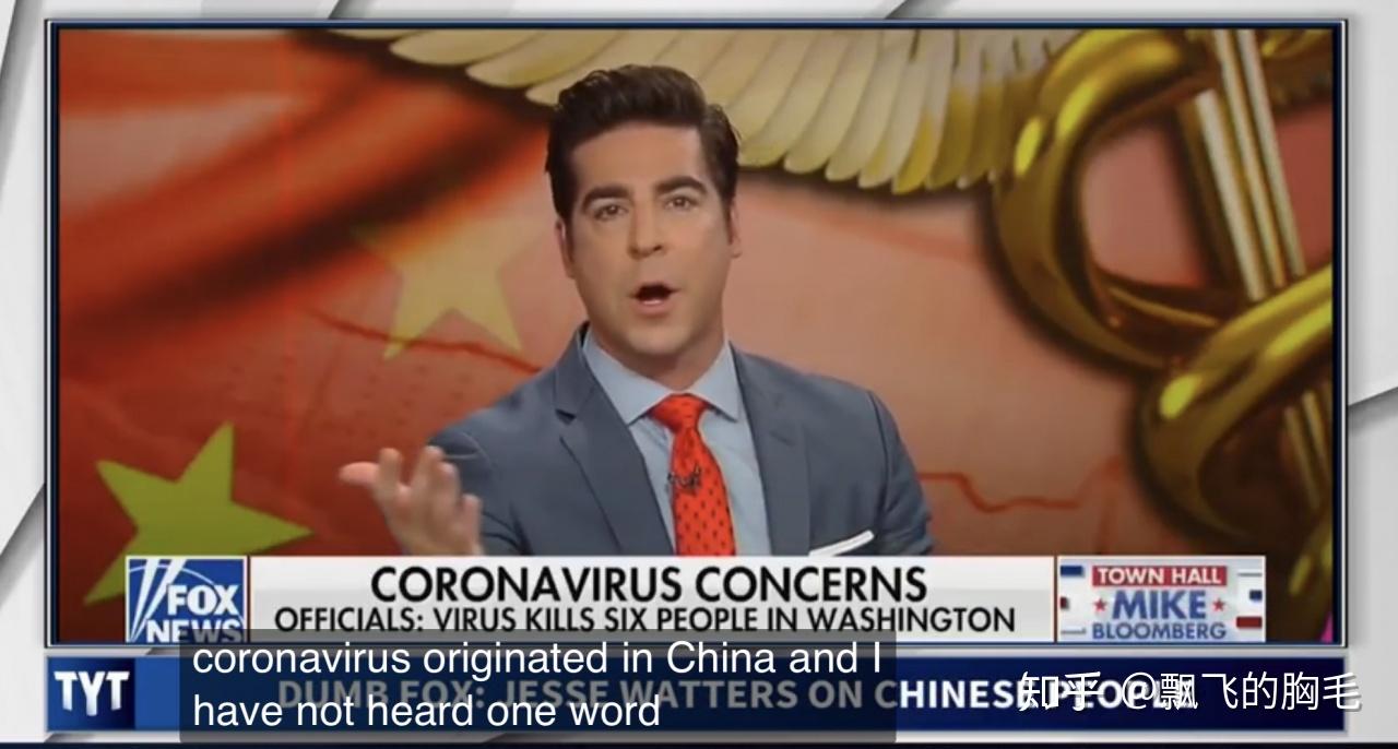 - FOX主持人Jesse Watters在新闻节目里要求中国人给他们一个正式道歉。除此之外,他还提到:“中国人正在忍受饥饿,他们有很多市场可以吃到生的蝙蝠。他们活在绝望中,他们吃的食物是生的,也不安全,正是因为如此科学家们才说病毒来自于中国”。