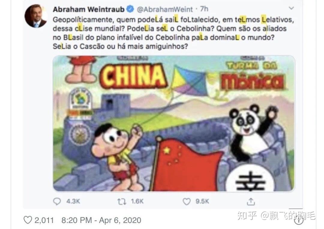 - 巴西教育部长Abraham Weintraub在推特上暗指“疫情帮中国政府统治世界”,并且发了一个拥有语言障碍的卡通人物,全文把R换成L,讽刺中国人发音有问题。