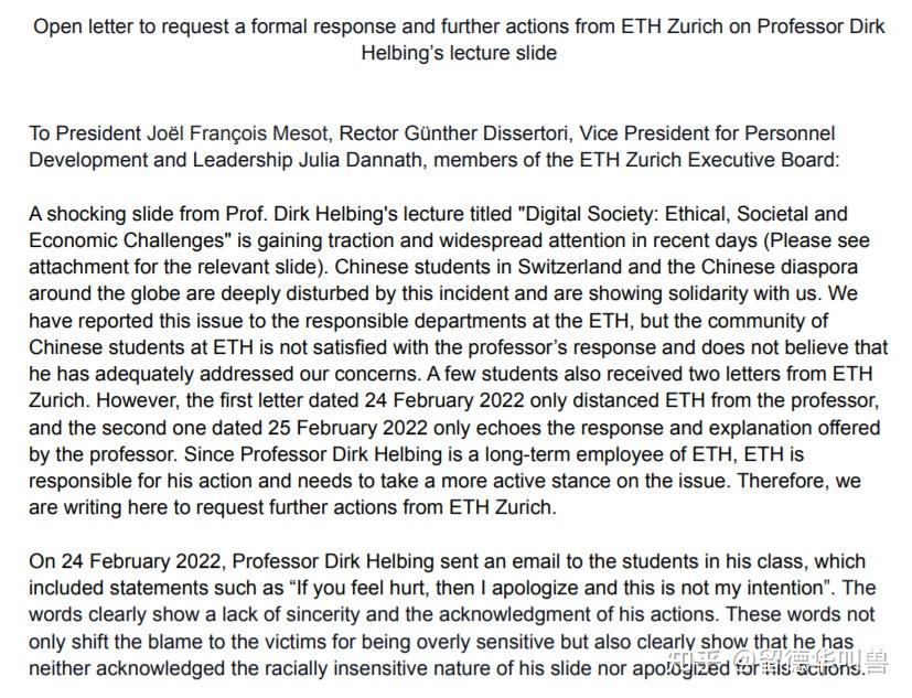 “我们对这张幻灯片中表现出的种族不敏感感到震惊,并要求苏黎世联邦理工学院和Dirk Helbing教授做出充分的回应。”