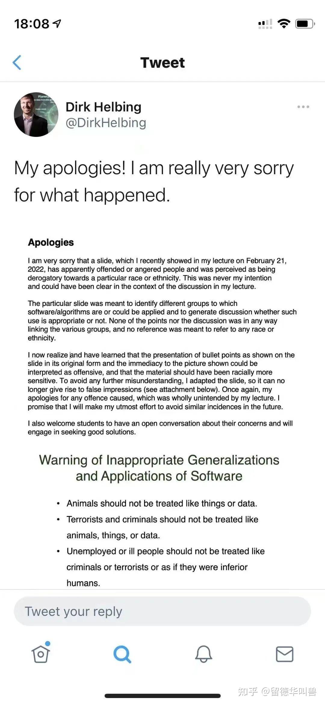 2022.02.28,Dirk Helbing教授终于在其社交媒体上发表公开声明并道歉。
