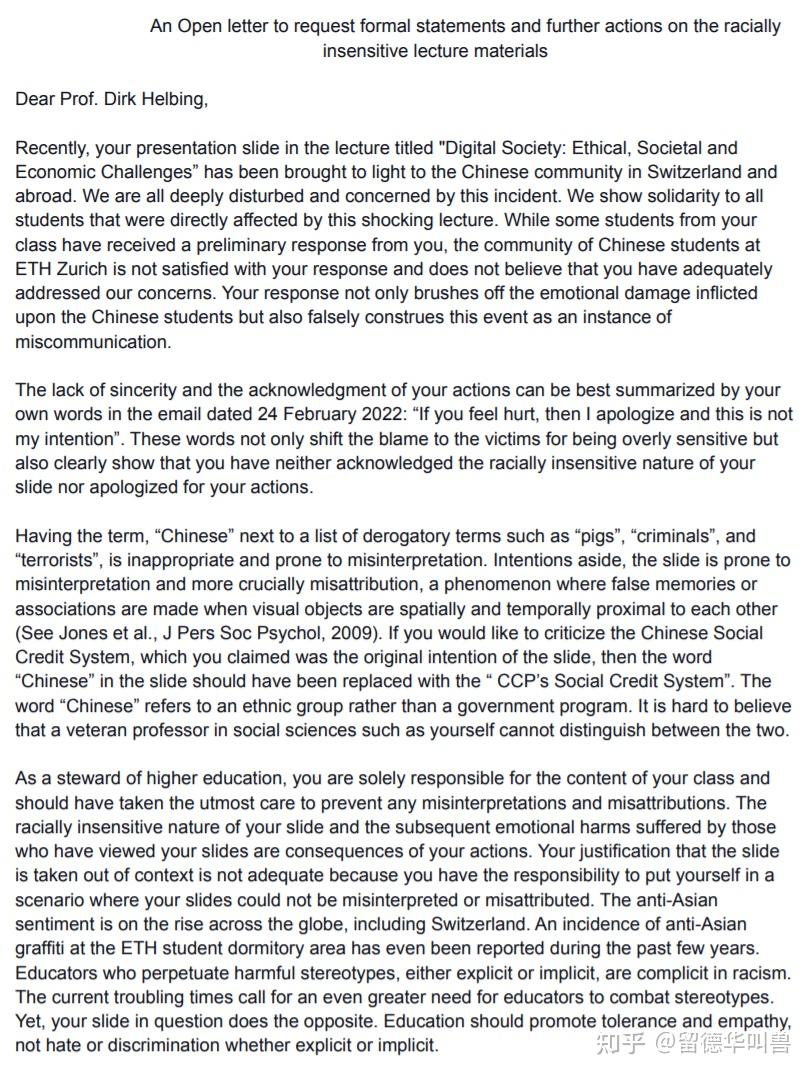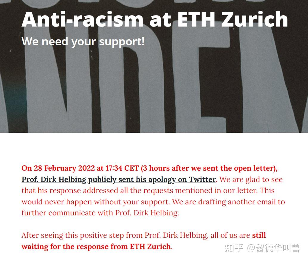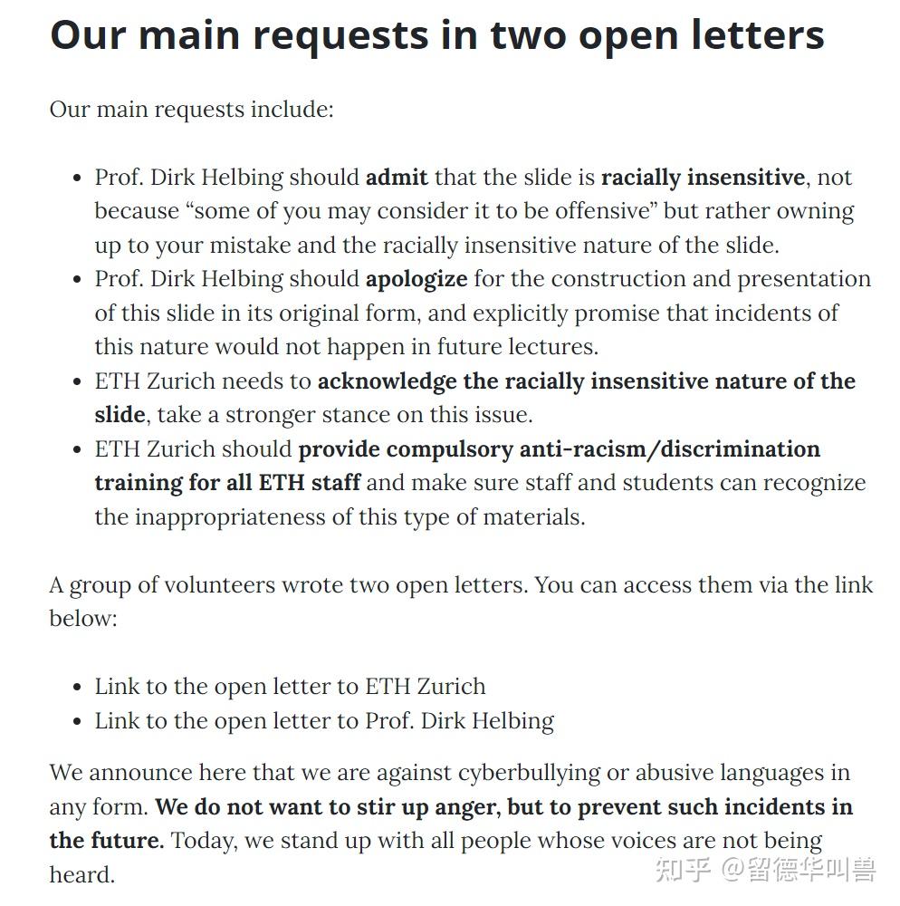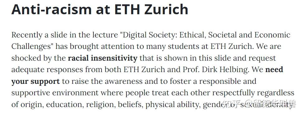 当你在社交媒体上评论时,请就事论事冷静理性的评论,切勿给教授发送人身攻击的邮件! 我们是anti-bias,但不是创造仇恨的!所有ETH的学生都是冷静理智克制的抗议,有理有据有条不紊! 请务必理智发言,不要上升到个人人身攻击!