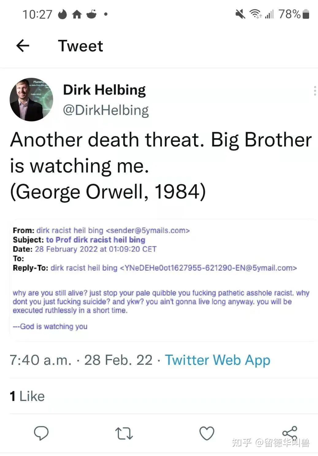 2020.02.26,Dirk Helbing教授在社交媒体上挂出了其一天内收到2封威胁邮件,称: